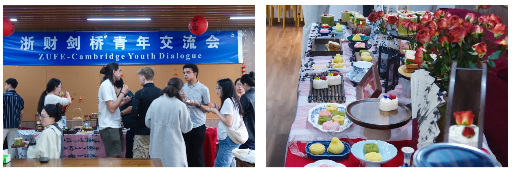 浙财—剑桥青年交流会以冷餐会形式展开,凤梨酥,绿豆糕等具有江南特色的美食,为全天的交流活动增添了温情。席间,中英学子畅谈校园生活趣事——剑桥学子分享了康河泛舟的传统,浙财学子则讲述了钱江观潮的体验。