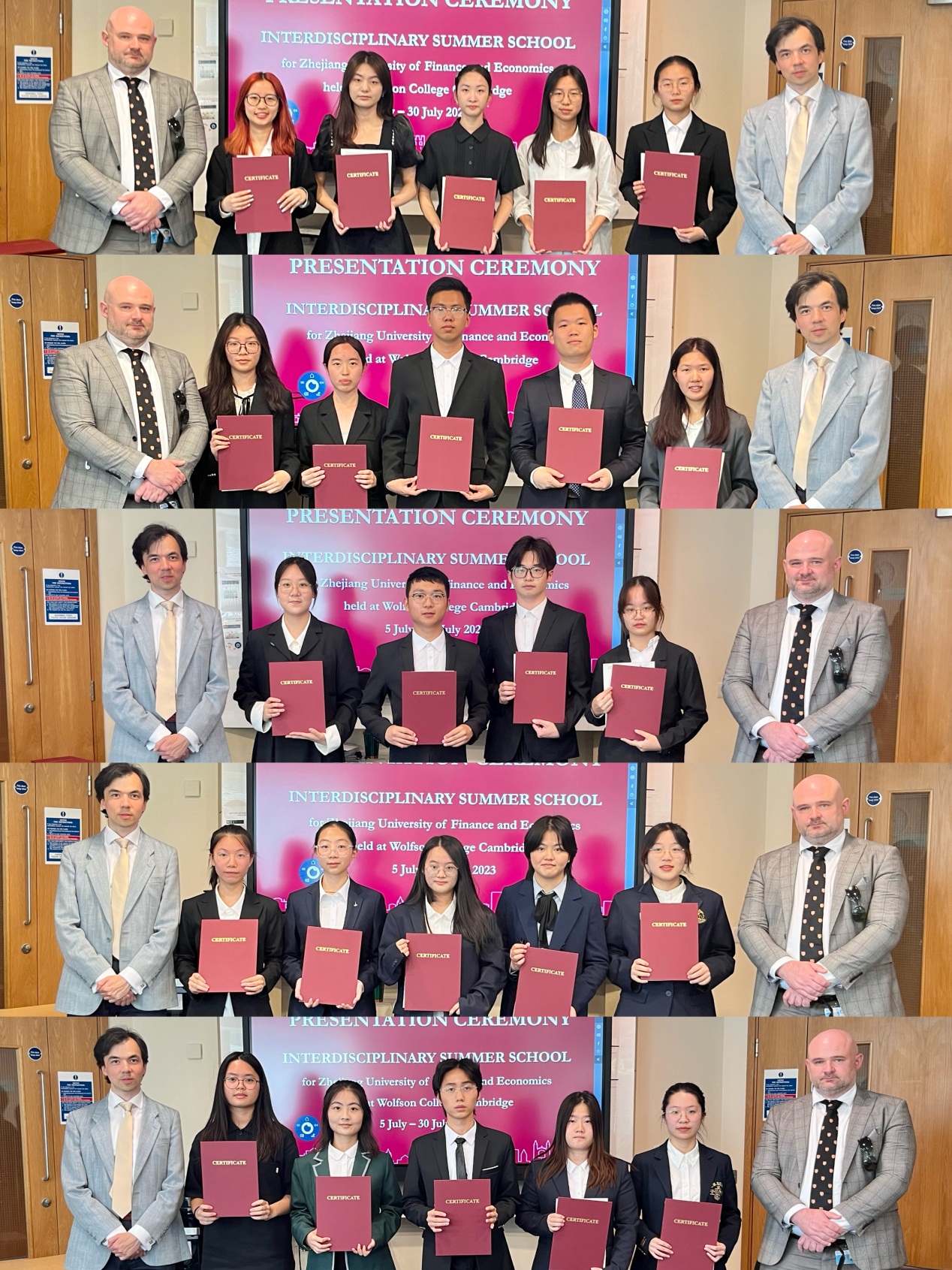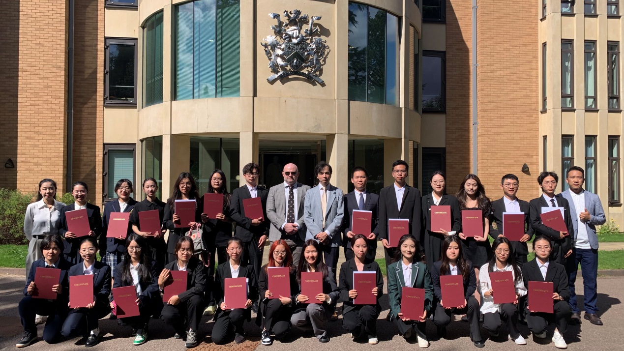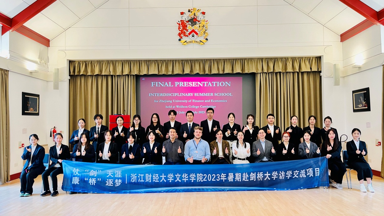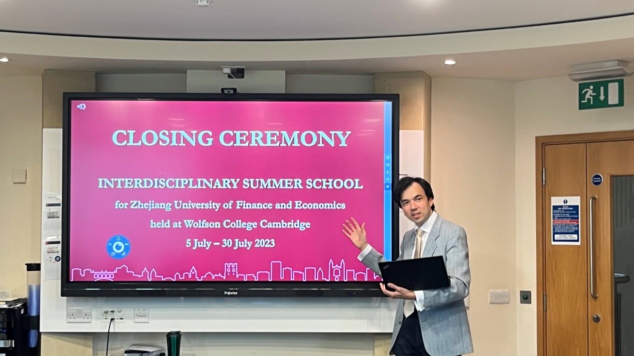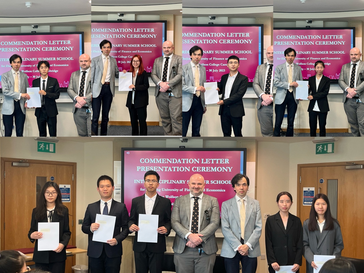 结业仪式上,查尔斯••鲁迪作为剑桥大学院方代表对学生结业汇报表现进行反馈点评,对同学们的结业汇报成果给予了高度肯定。他表示,各小组的专题汇报角度新颖、内容详实、逻辑清晰、跨学科知识运用得当,全面的反映出访学团成员在本次项目学习中的成长与收获。The ZUFE Five小组(林袁凯、王语紫嫣、许正阳、周哲源、叶轩彤)全员以及胡梓茵、章殷华、陈雨欣和李嘉琪四位同学以出色的汇报表现获得教授推荐信。