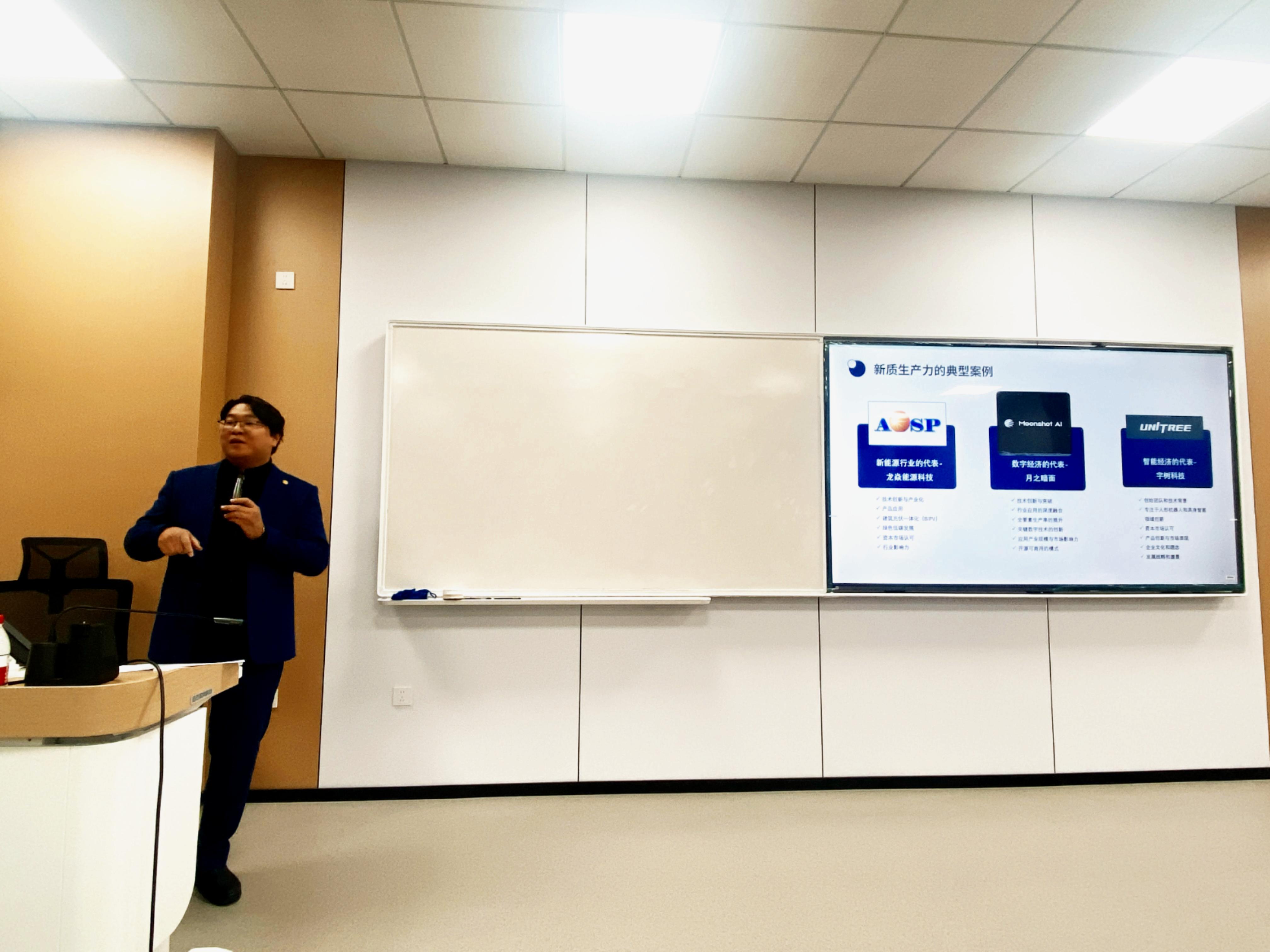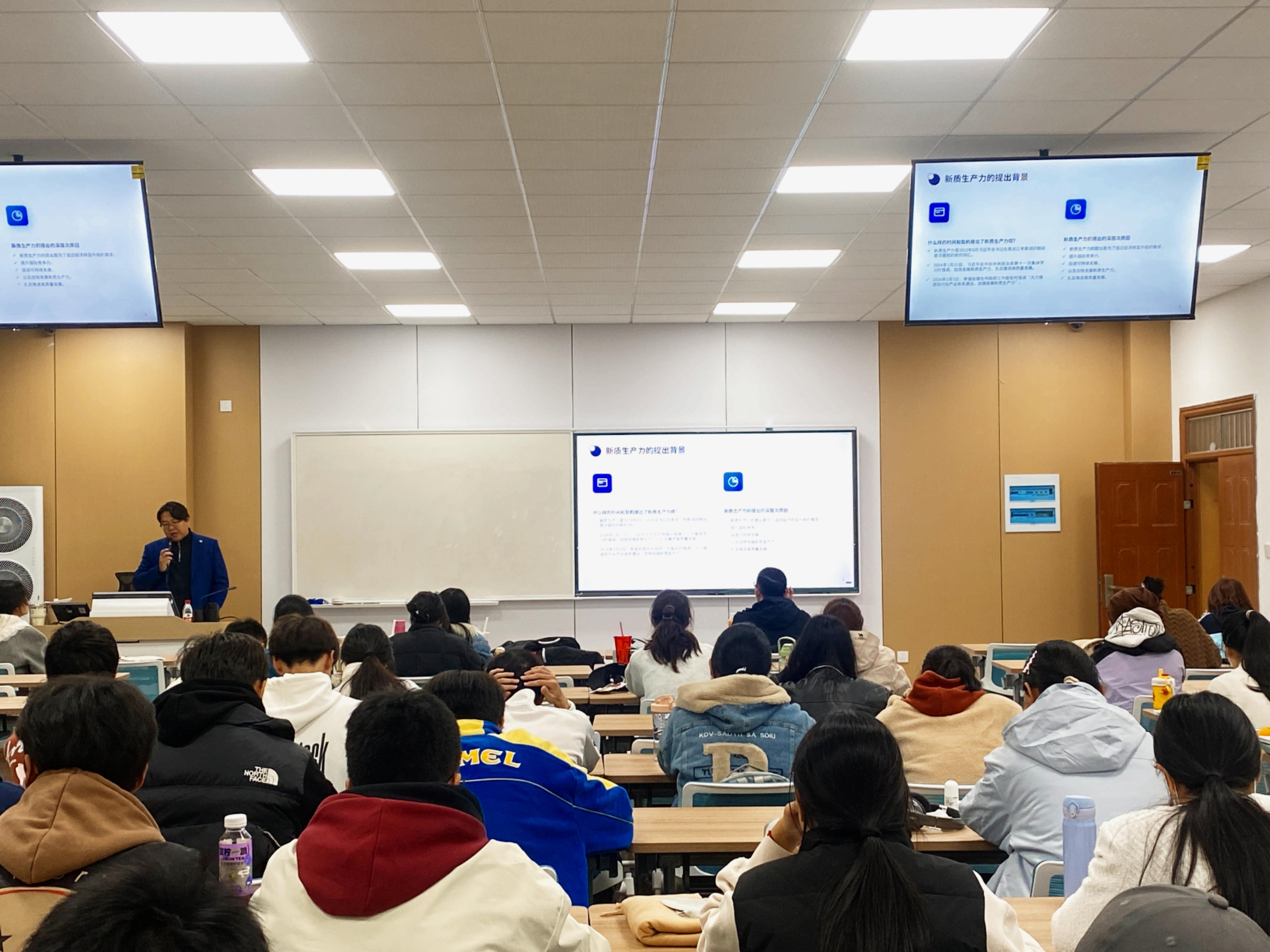讲座伊始,许董以风趣幽默的语言,巧妙引入了新质生产力这一主题,强调了解事物底层逻辑的重要性,瞬间吸引了在场每一位同学的注意力,现场氛围十分活跃。许董指出,新质生产力是一种创新驱动的生产力,摆脱了传统的经济增长方式和生产力发展路径,具有高科技、高效能、高质量的特征,符合新发展理念的先进生产力质态。其特点在于创新驱动、数据要素的重构作用以及技术群体性突破。许董强调,新质生产力的催生动力主要是科技创新、产业融合和绿色发展,这需要在座的每位同学都有这种理念。