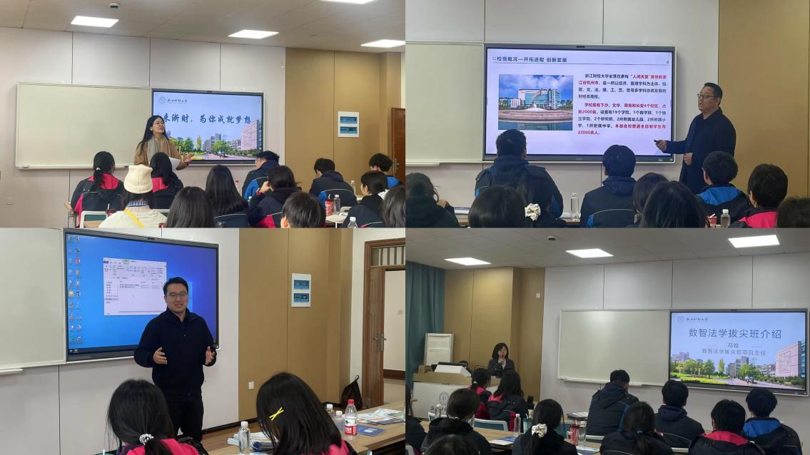 学院党委书记沈晓敏在主持中对研学团的到来表示热烈欢迎,并向同学们分析了AI时代新文科专业的不可替代性,希望同学们明晰未来发展规划,学会在报考中处理好学校、专业、班型等关系。执行院长叶舟从学院发展历程、办学理念、培养特色、班型设置及招生政策等向同学们作详细介绍,特别强调作为对优秀本科生实施培养的荣誉学院,学院将立足使命定位,致力于培养MAQ型“浙财金生”。金融学院副院长金骋路从多个角度分析了数字金融的未来发展趋势,生动展示了金融专业在数字化时代的演变历程,并向同学们介绍了数智金融强基班培养理念,鼓励同学们积极关注。数智法学拔尖班项目主任冯姣围绕专业培养目标、班级特色、课程设置以及学业要求等向同学们详细介绍了数智法学拔尖班相关情况,使同学们对未来大学学习有了更好的了解和规划。24级数智会计拔尖班班长崔嘉容作为学生代表,向同学们分享了在校生活学习情况。